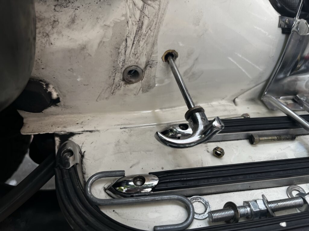 留め具が外れてしまいました。。これ、鉄製のボディの中で止められているので修理するにはボディの中に手を突っ込まないといけない。鉄製の一体整形ボディを採用してるベスパは一部分外して中に手を入れると言う事が出来ないんです。