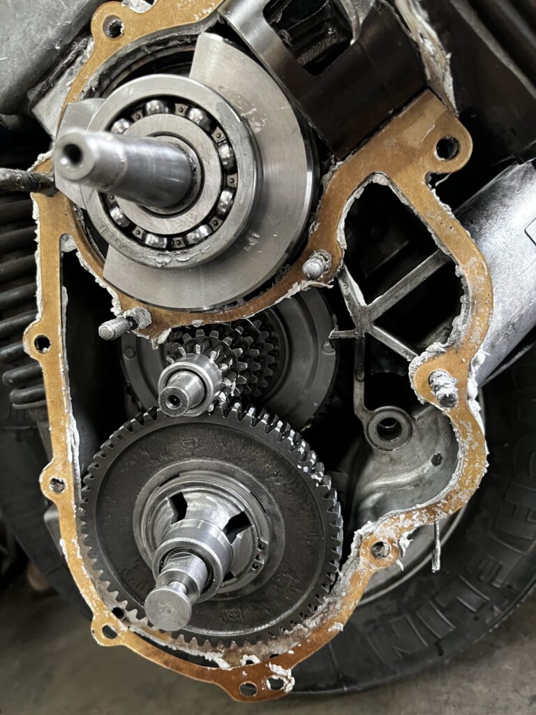 アホみたいにシンプルですがこれが駆動系の構造のほぼ全部。これ以外には一番上のクランクシャフトの向こう側にクラッチユニットが付いている。