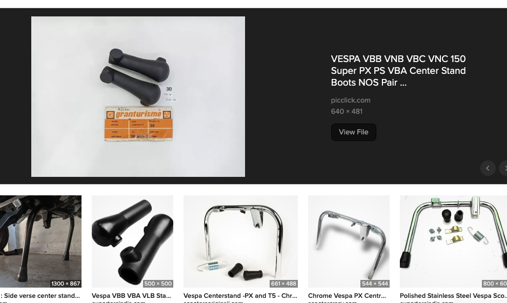 素朴な疑問として、ベスパのセンタースタンドにはなぜ90度の角度でブーツに出っ張りが付いているのか?ひとつはスタンドをバタンと跳ね上げたときにステップボードにスタンドが強く当たるの防ぐためにゴムの緩衝材になっている。もう一つはスタンドを立てるときに足を引っ掛けるところなのかな?と思っていたが、今日これを書こうと思ってネットでセンタースタンドブーツの写真を検索していたら、その写真でやはりその可能性が高いと納得。