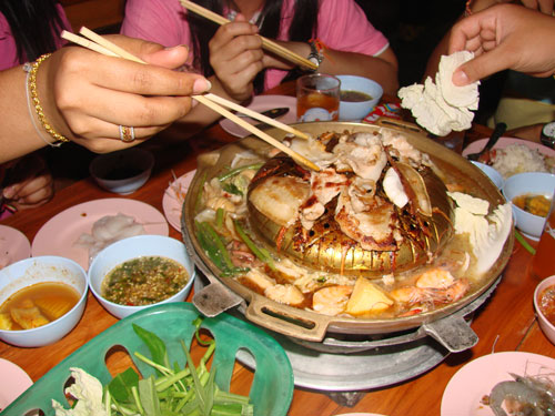 ところがやっぱりなんか上品すぎてパンチが足らなかったのか、晩飯の時間が近づいてくるとまたムーカタが食いたくなってきた。彼女に「もっかいムーカタ行こう」というと変な顔をされた。そりゃあ1日に2回もムーカタ行くような奴はいないだろうからなあ。そして検討の結果以前、一休氏に教えてもらったナンリンチー通りとラマ3の交差点のあたりにあるムーカタ屋に決定。一人あたり89Bの食い放題でまさに典型的ムーカタ。ここでは鳥・豚・牛の3つがそろってたので勇んで皿に山盛り取ってきて食って食って食いまくる。ビアシンを3本開けてトータル金額500Bちょっと。やっぱ安い。そしてBBQ Plazaと比べると衛生面も若干心配な面もあるが、そのドキドキ感と食い放題の満腹感を持ってムーカタの本質と自分の中ではがっちり結論づけさせて頂きました。やっぱムーカタ食いたい時はBBQ Plazaではいけません、ちゃんと食い放題のムーカタ食わないと心の底から満足はできないですよ!(誰に向かって言っているのか自分でもよくわかりません)