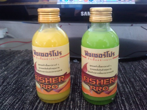 ジョムティエンの釣り堀で購入した集魚剤。一本40B。集魚剤とは言っても基本的にはただの人工香料だろう。ご丁寧にいろんな香りのものがあり、バナナの香りやらバイトゥーイの香りなど数種類がある。