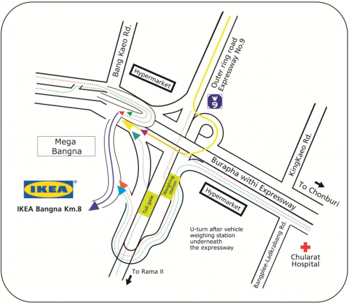 チョンブリ方面からだとバンナートラートの側道からアウターリングの交差の部分で高架下の薄暗いUターン道路を超えてIKEAに入る。どちらもわかりにくく、道が細くて暗かったりで不安になる。この辺改善しないと始めてくる人は絶対迷いますぜ。