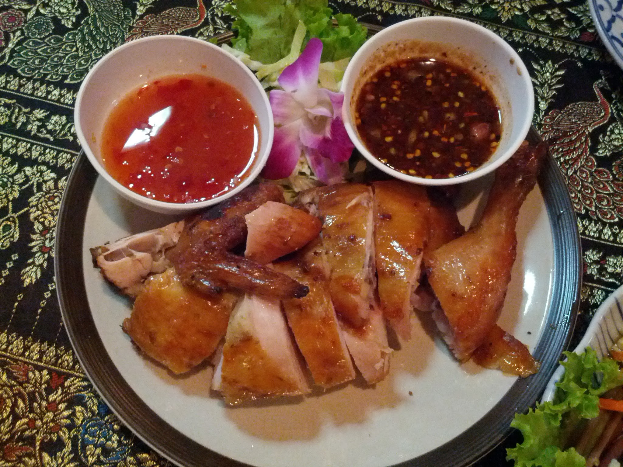 ↑ ไก่ย่าง ガイヤーン。皮がパリっと焼かれてて実に旨そう。ちょっと肉がハムみたいな感じで都会的なガイヤーンでした。