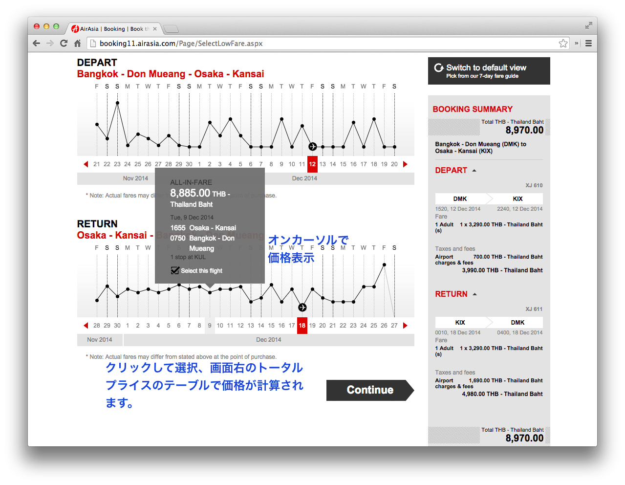 そうすると指定した日程のまわりの日程で最安値チケットがいくらであるのかをグラフで表示してくれている。左のグラフのところはマウスのオンカーソルで金額表示、クリックすると画面右のトータル金額に組み込まれて金額の計算が行われる仕組みです。これ、航空券をお値段第一プライオリティで探してる人にはめっちゃ便利です。最安値がすぐに目視確認できる。今のところこの仕組を利用しているのはこのAirAsiaと航空会社をまたいで最安値航空券を検索できるSky Scannerというサイトの2つだけしか見たことがありません。。。