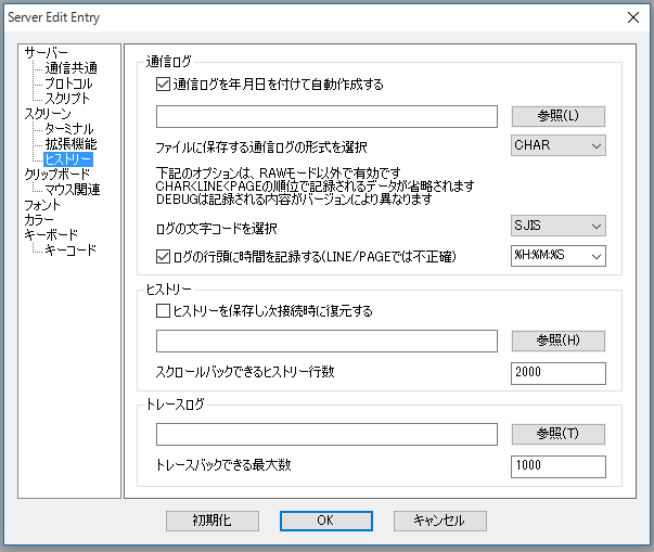 SFTPや画面のカラー指定やらMDI仕様などもいいんだけど、一番嬉しいのはログ保存機能。下のヒストリーの設定画面で「通信ログを年月日を付けて自動作成する」にチェックを入れてフォームにログファイルのパスを入力としておくと