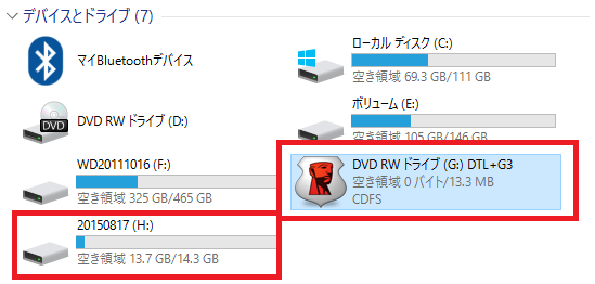 ↑ H:ドライブが上記で書いてる”Kingston”に該当するドライブ。ドライブ名をその後自分で変更しました。