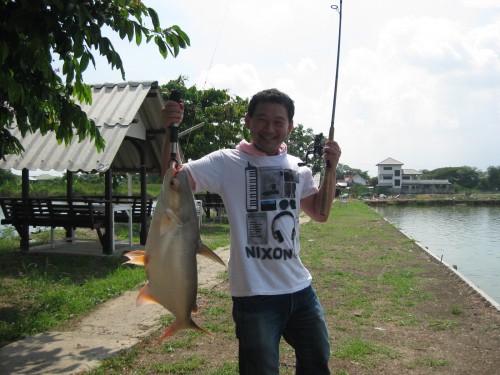 BungMaaRuai釣り堀でまたガンガン釣って来た 2011年05月05日 2011-05-072013-02-01 yamagiwa2000 スーパーサイズダイエット日記, 釣り Leave a comment 日本から来た友達がタイの田舎のほうに行ってしまったため、タイでも祝日の5月5日が暇になった。 というわけで暇なら行くべ!ということでまた先日と同じブンマールワイという釣り堀に行って来た。今回は朝から出かけたお陰で人がほとんど居ない。好きな場所が選べる。しかし、まだ昨夜の片付けが済んでなかったのか、各テーブルの上に食い残しの料理が残っていて汚い。。それはともかく厚いのでちゃんと大きな木がある下の影を見つけてそこを釣り場にと陣取る。 魚はプラーサワイ(ナマズ)、プラーブック(メコン大ナマズ)、プラーガポン(スズキ)あたりが居るらしいがプラーサワイ以外を釣ってる人を見なかった。ちなみに釣り料金が竿一本100B、貸し竿が100B、エサ代がたしか60Bぐらいだったような気がする。後は注文するビールやら料理やらの値段。 風景はこんな感じで落ち着いたところ。景色も良い。 釣り場にはちゃんとこういう小屋が建てられていて日陰があって休むこともできる。 そして早速ヒット。昼間からでもガンガン掛かる。50cmから90cmクラスがボコボコ釣れてもう余は満足。 こんなのが釣れるんです。 竿がしなるしなる。 普通にビール飲んでゆったりと釣りしてるところを写真に撮ろうと言って竿を手に取った次の瞬間、ジーッとリールから糸が引き出されて(ちなみにプラーサワイの場合、アワセ不要)、 「掛かったー!」 でまた竿をしならせながら巻いて巻いて寄せて上げる訳です。うーん楽しー。 というわけでまた行く!釣り堀、海釣り、川、湖の淡水釣り、3つとも遊びまくる!しかし、タイでしか釣れないこういう淡水の巨大魚もやってみるとやっぱり楽しいもんだ。