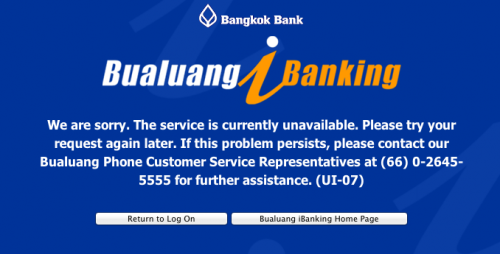 それはさておき、バンコク銀行のiBankingで、パスワード変更後ログインしようとしたらService is currently unavailableと出る。パスワード変更でなんか間違いでもしたかな?と思ってその日はそのまま寝た。一時的にロックされただけなら次の日にはまたログインできるようになっているはずだし。