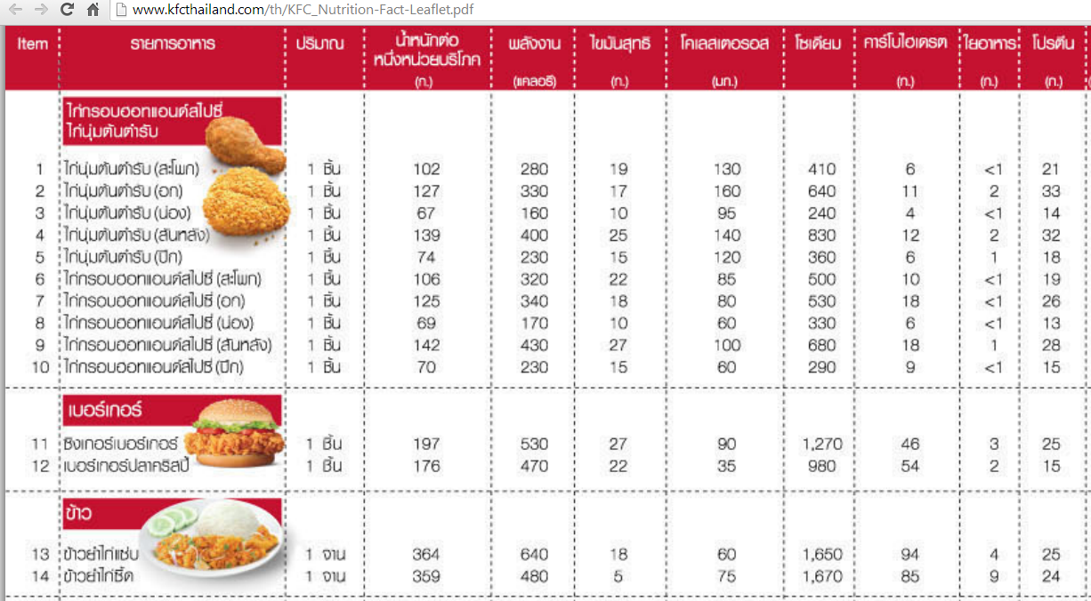 以前タイのマクドのカロリー表をあげたことがあるが、タイのKFCのものはないと思いこんでおりました。が、たぶん古いもので、現状はサイトから削除されてしまっていると思われるものであればタイの巨大掲示板サイト、Pantipにあがっていた。