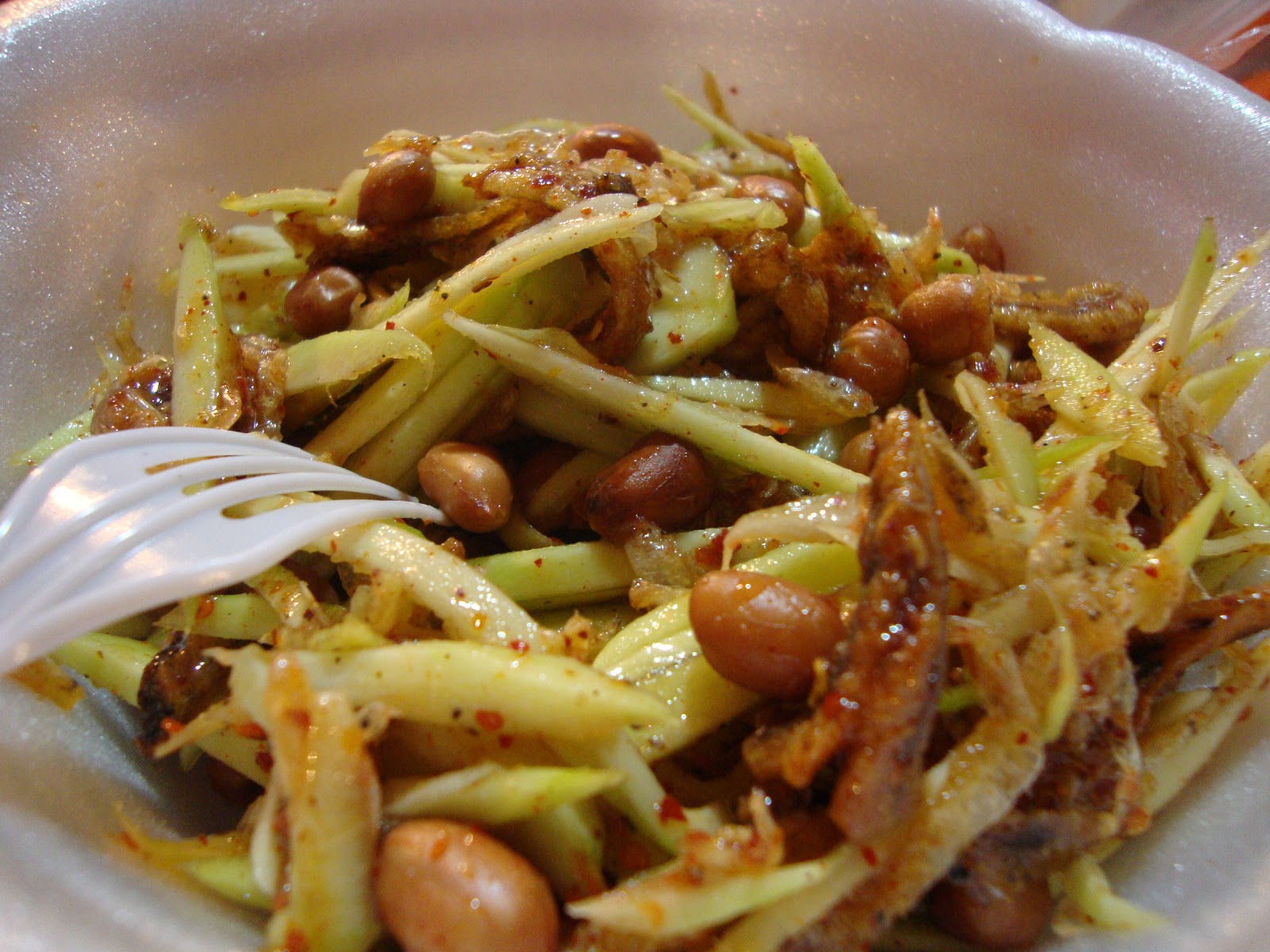 ยํามะม่วง ヤムマムアン、最近これにハマっている。マンゴーの熟す前の果肉が若干粉っぽくてすっぱい奴を千切りにして、飴状の甘いタレと唐辛子、ナッツ、干しエビなどと会える。甘くて辛くて酸っぱくて、干しエビのエビ臭さ、塩味が複雑に絡み合っててうまい。