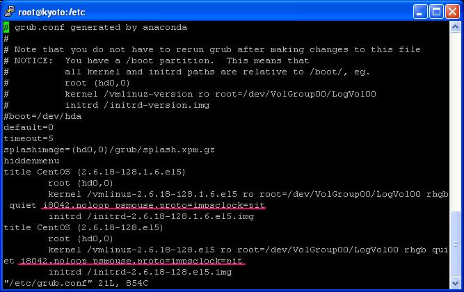 viかemacsで、/etc/grub.conf を開きます。(あ、ちなみに、開く前にgrub.conf.oldなんかの名前で バックアップをとっておきます。)